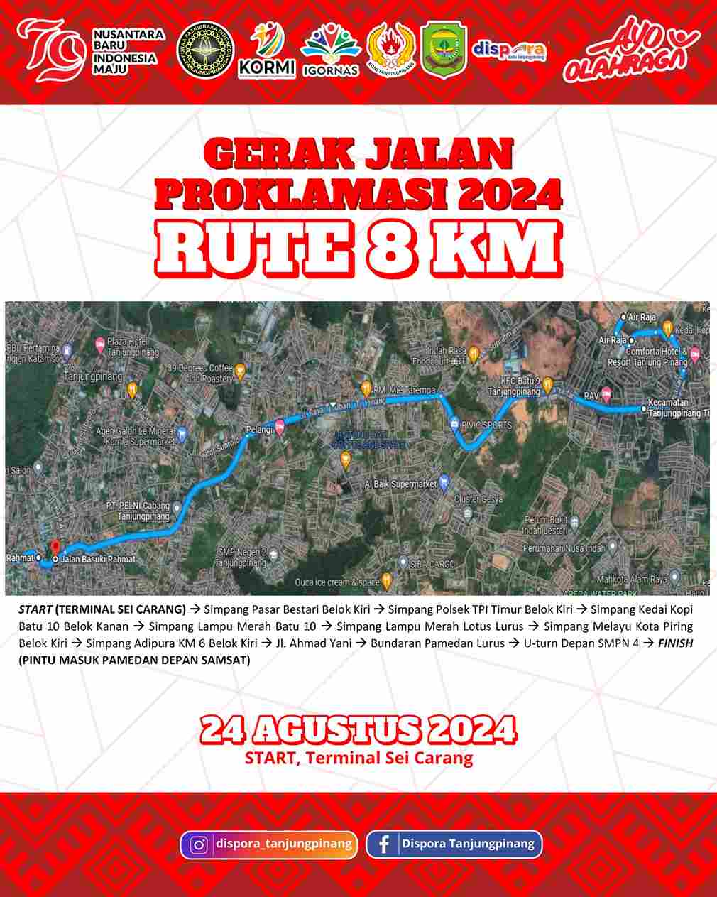 Gerak jalan sejauh 8 kilometer akan dimulai dari Terminal Sei Carang sebagai titik start. Peserta akan berjalan menuju simpang Pasar Bestari dan belok kiri menuju simpang Polsek Tanjungpinang Timur, belok kiri ke arah simpang Kedai Kopi Batu 10, lalu belok kanan ke simpang Lampu Merah Batu 10.