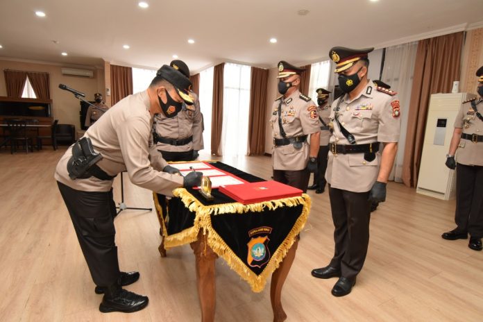 “Pada saat sertijab dilaksanakan juga penandatanganan berita acara serah terima jabatan, berita acara sumpah jabatan serta penandatanganan pakta integritas, yang merupakan hal wajib dilakukan kepada pejabat yang dilantik,” kata Kabid Humas Polda Kepri Kombes Pol Harry Goldenhardt S., S.IK., M.Si.