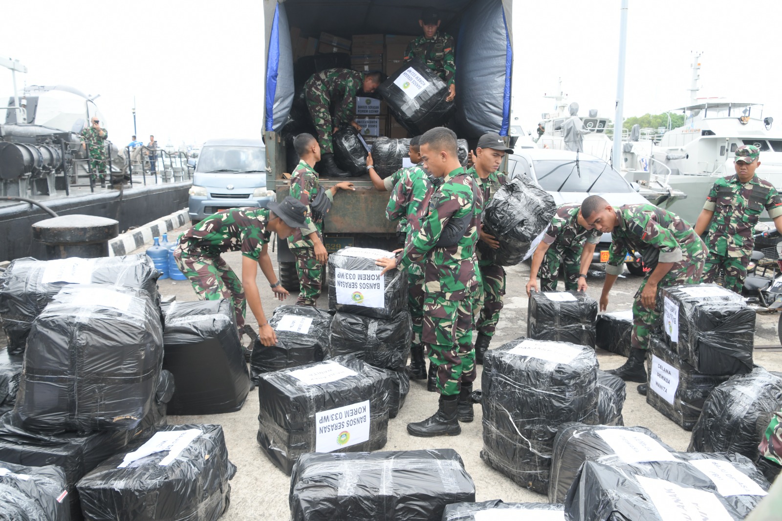 Adang Purnama mengatakan paket bansos yang sudah terkumpul ini akan diangkut menggunakan dua unit kendaraan truk Korem 033/WP yang nantinya akan bergabung dengan pengiriman paket bansos dari Koarmada 1 TNI AL dengan menggunakan KRI Silas Papare dengan Komanda KRI Letkol Laut (P) Agus Yunianto.