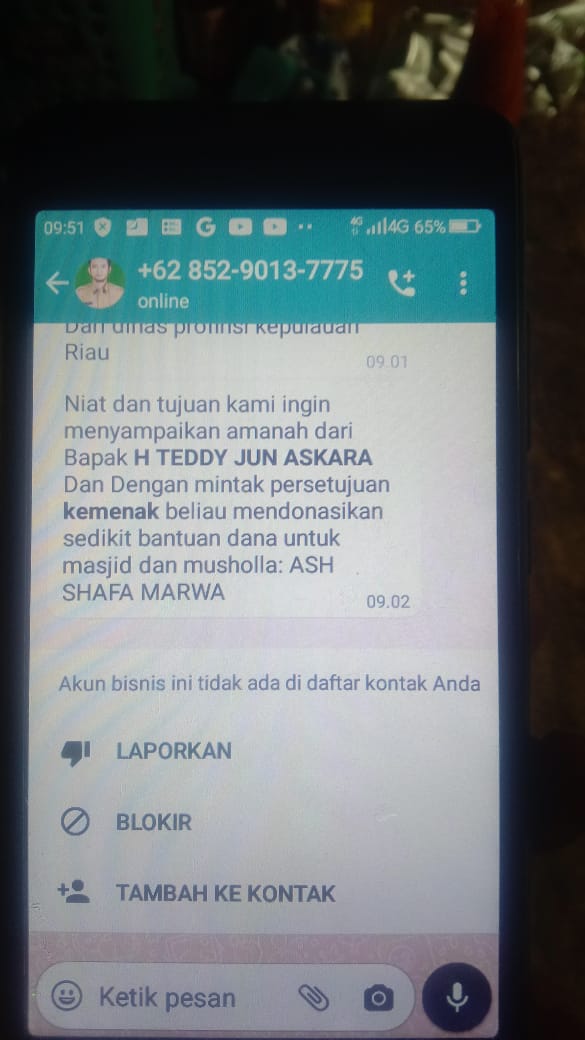 Namun untuk kali ini jenis penipuan yang mengatasnamakan Ketua Fraksi Partai Golkar DPRD Kepri, Teddy Jun Askara (TJA) justru berbeda. Dalam pesan yang dikirimkan ke sejumlah orang dan pengurus Mushola dan Masjid, TZA justru dikatakan akan memberikan bantuan.